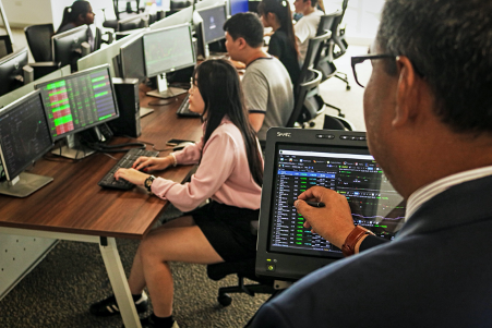 The state-of-the-art financial dealing room provides students with a unique learning experience. Students have access to ICTrader, one of the most sophisticated trading simulation systems. The system is simulated to trade equity, foreign currency and derivatives in the US and UK markets. Students get the experience of being at a trading desk, working under pressure with sharp and sudden movements in share prices. Students develop their ability to think quickly, assess risk, examine options and remain calm under pressure.